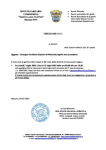 111. Circ.111 Consegna Documenti Cl. IV Sc. Sec. Di II Grado